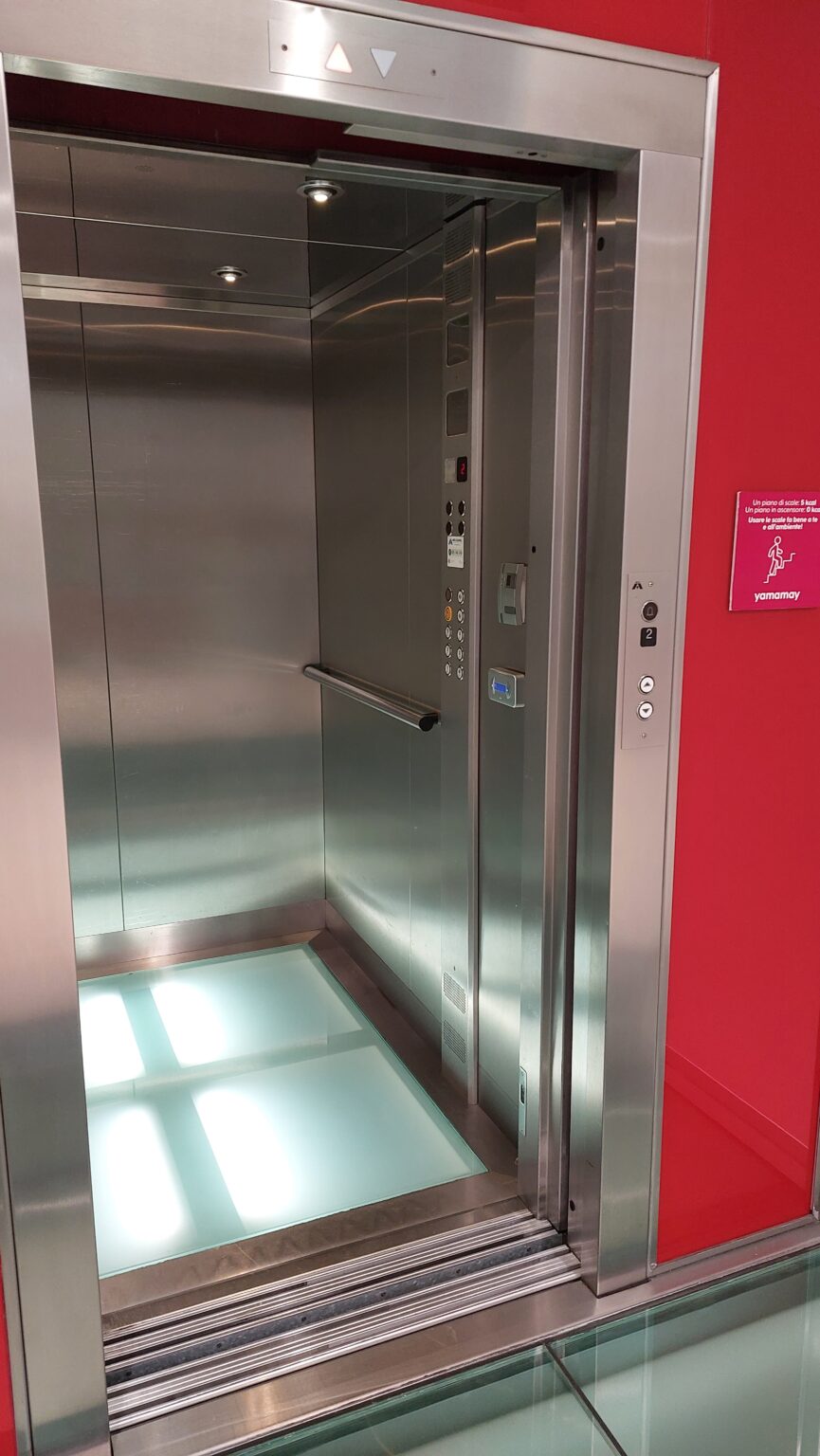 Chiudono le finiture di pregio, l’illuminazione mediante faretti a led su cielino in acciaio inox lucido super mirror, il pavimento realizzato con lastra di vetro stratificato temperato predisposto per retroilluminazione e le porte di piano e di cabina a due ante scorrevoli automatiche in vetro stratificato non intelaiato.
